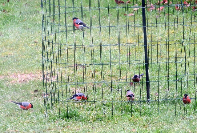 Six of the ten Bullfinches ( visiting a garden daily)